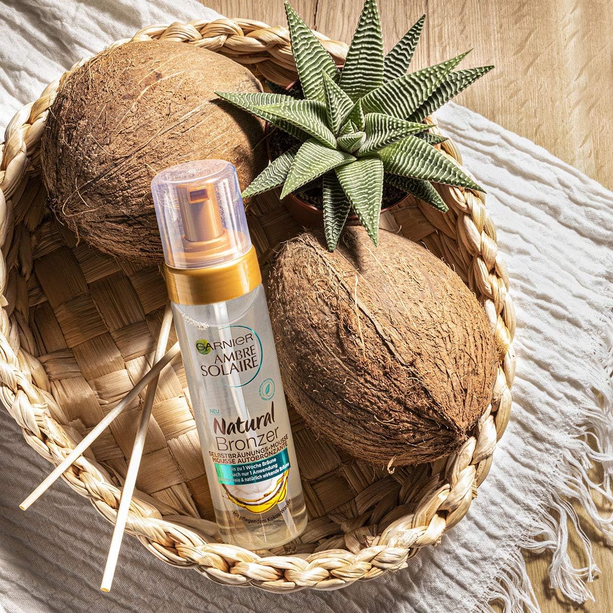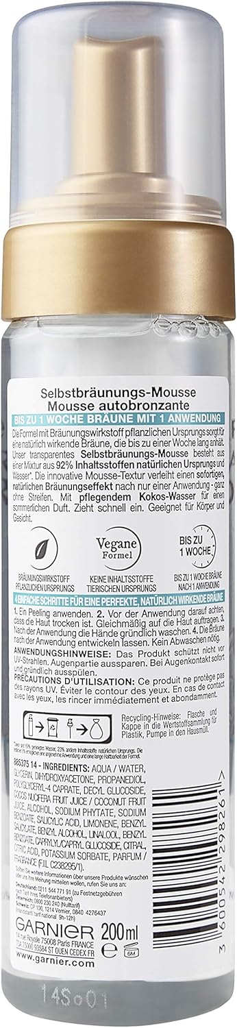 - Box contents: 1 x Garnier Ambre Solaire natural bronzer self-tanning mousse with nourishing coconut water, 200 ml