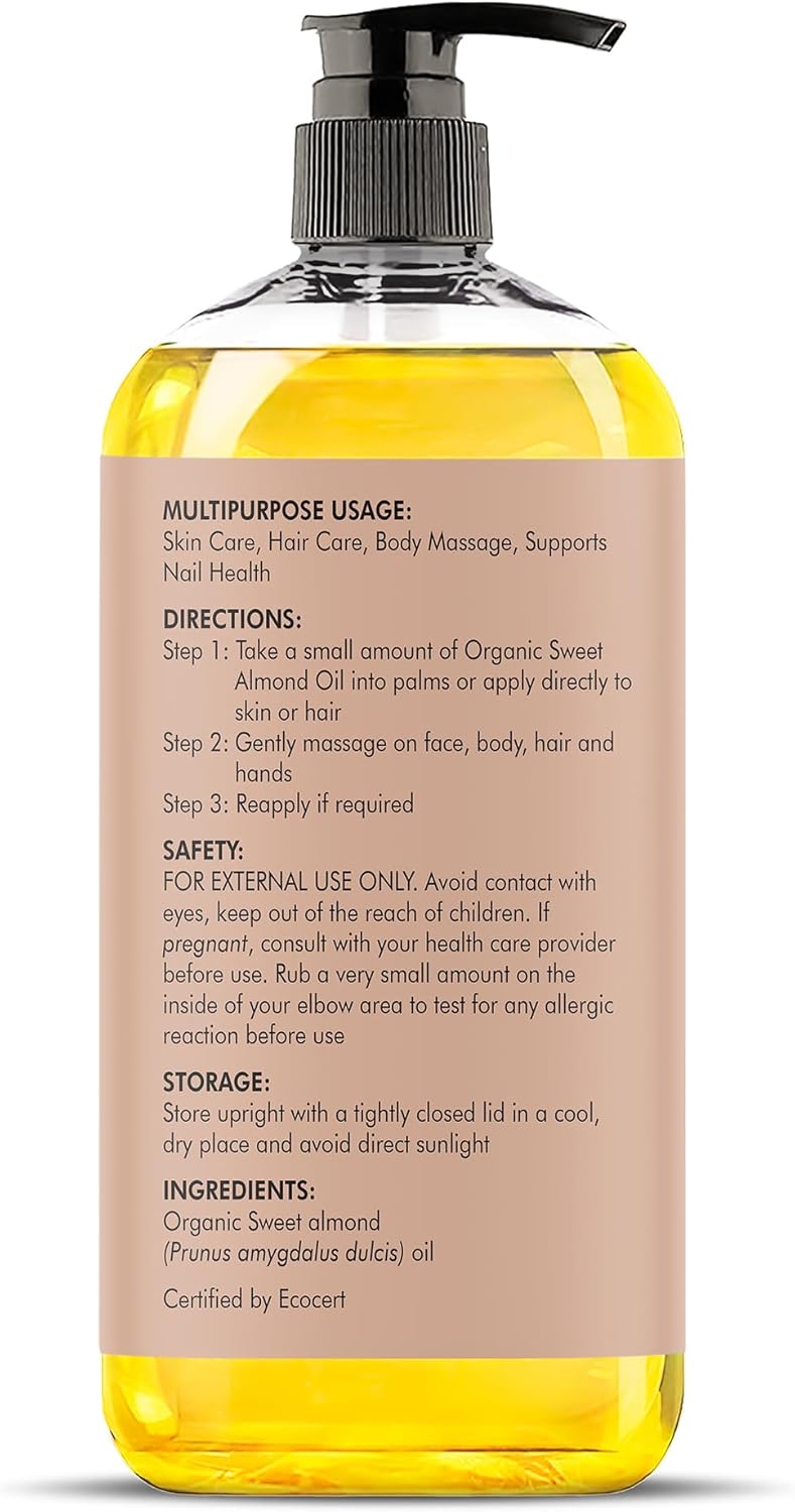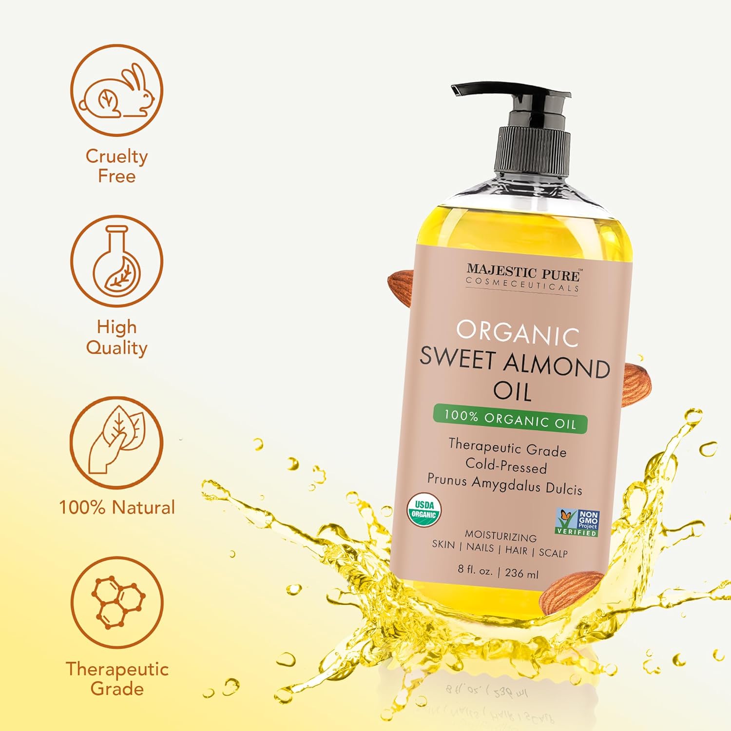 Majestic Pure USDA Organic Sweet Almond Body Oil | Large 236 ml | 100% Pure & Natural Cold Pressed Oil Sweet Almond Oil for Skin, Face, Nails, Hair, Scalp & Massage | 236 ml