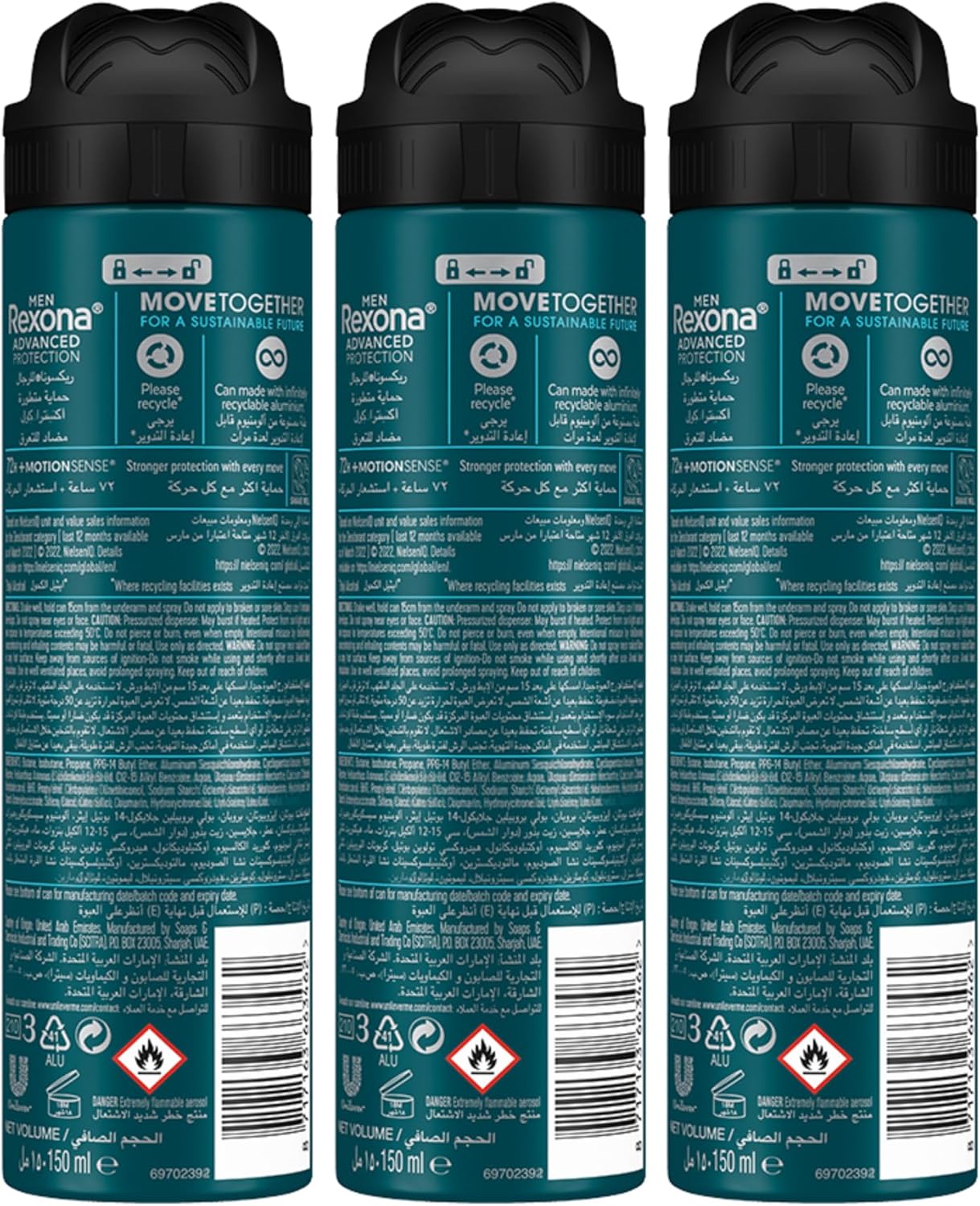 REXONA Men Advanced Protection Antiperspirant Deodorant Spray, 72 hour sweat & odor protection, Xtra Cool, with MotionSense technology, 150ml x 3