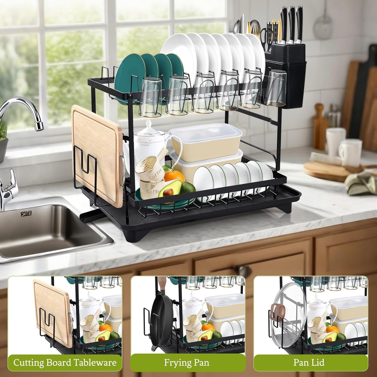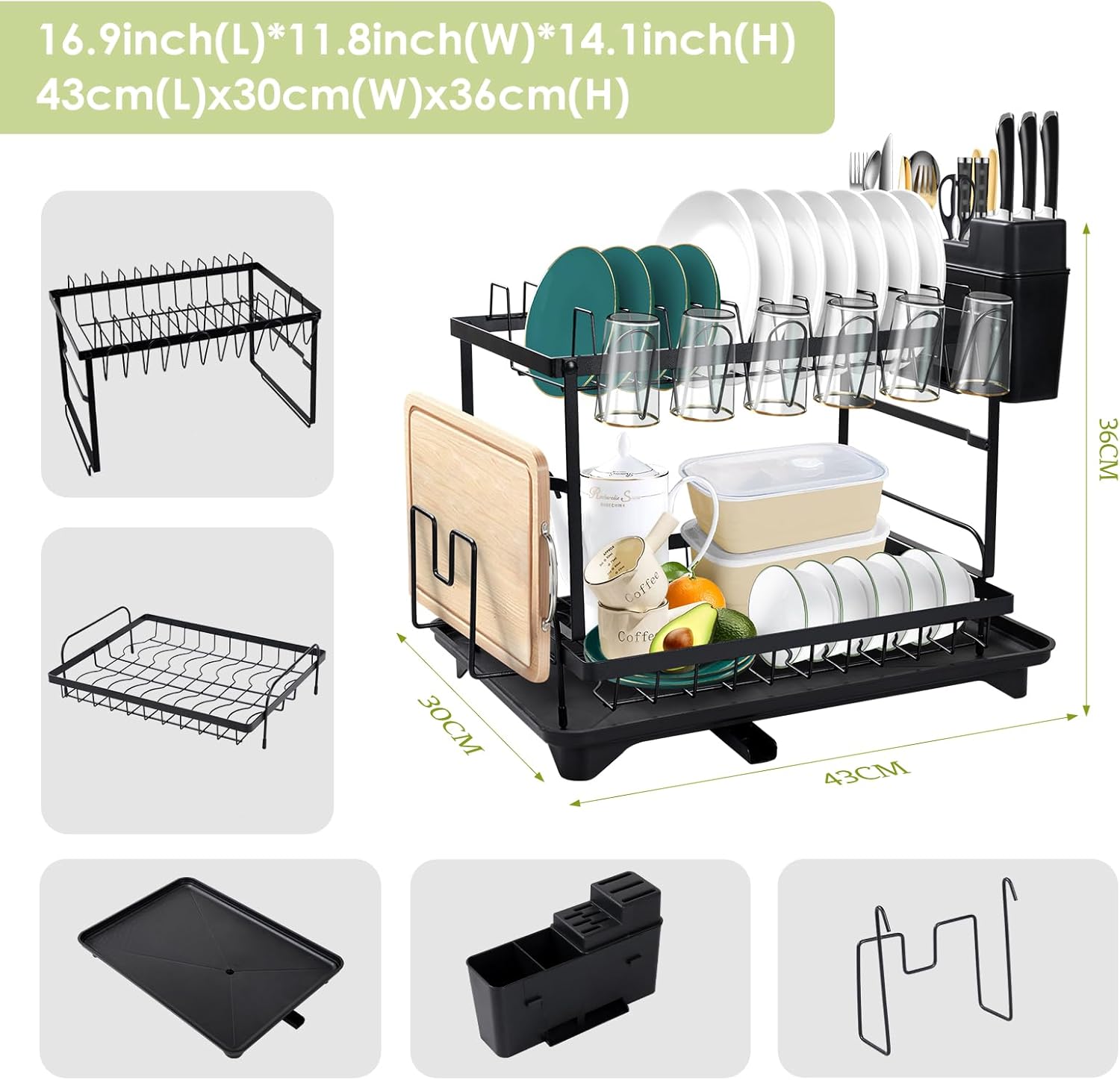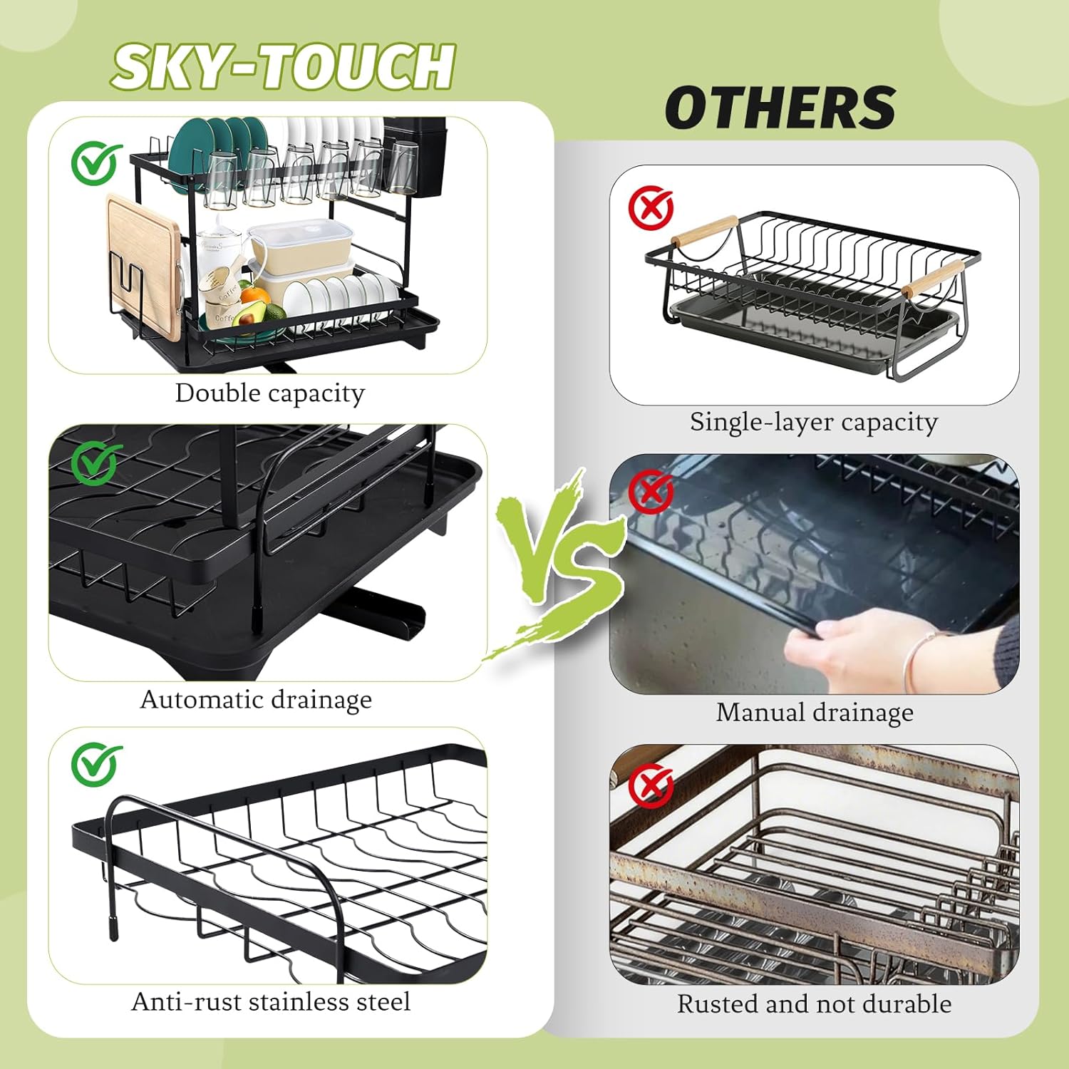 SKY-TOUCH 2 Tier Dish Drying Rack, Dish Drying Stand & Drainer, Saving Space with Swivel Drainage Spout, Utensil Holder, Cup Holder, Cutting-Board Holder and Plate Holder Stand for Kitchen Counter