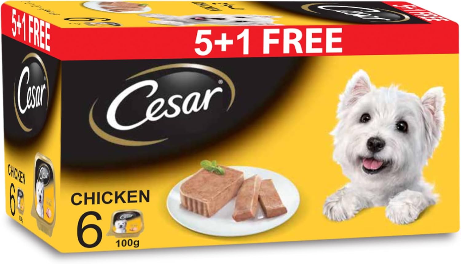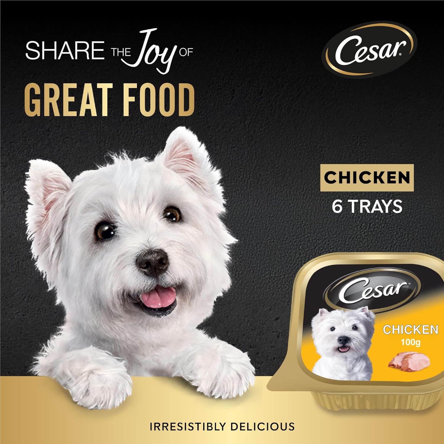 Cesar Dog Food, Chicken Dog Wet Food, Tray of 6x100g, Formulated Without Grains, Complete and Balanced Dog Nutrition