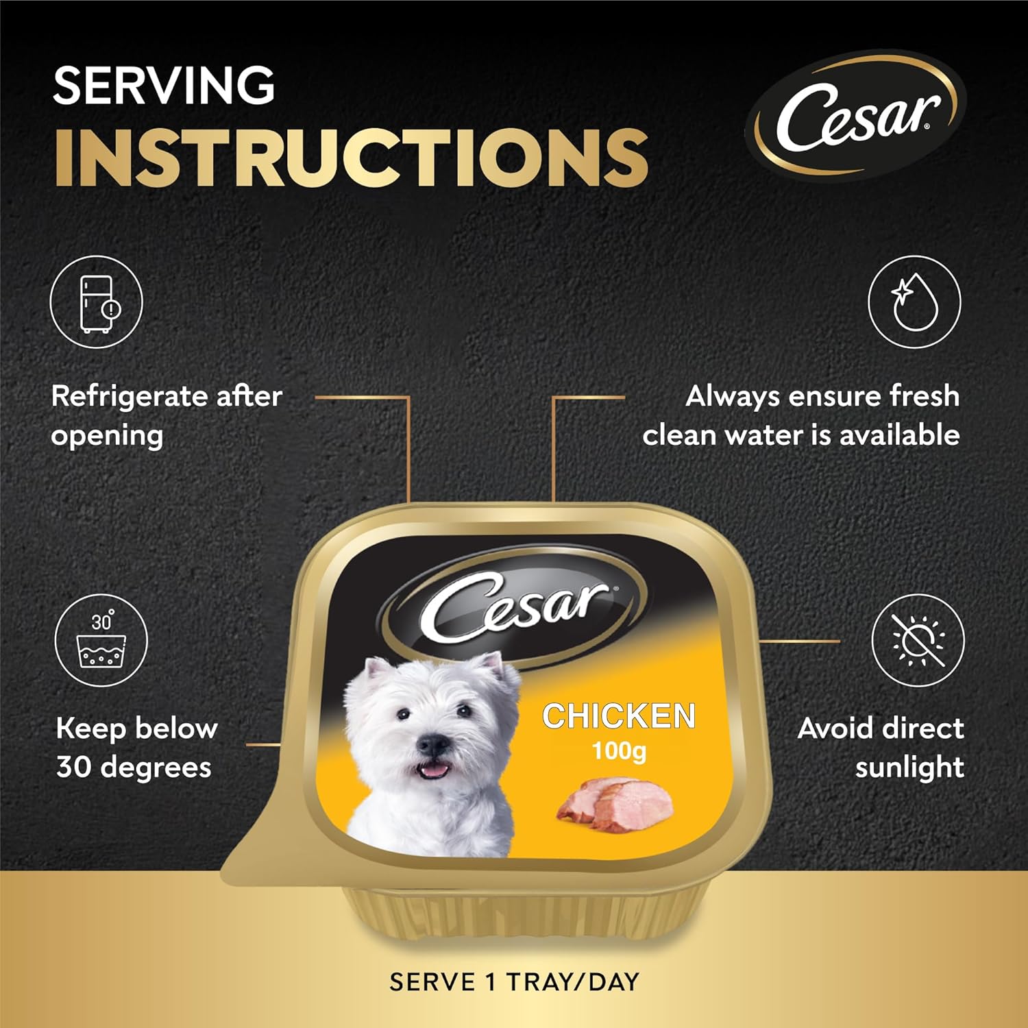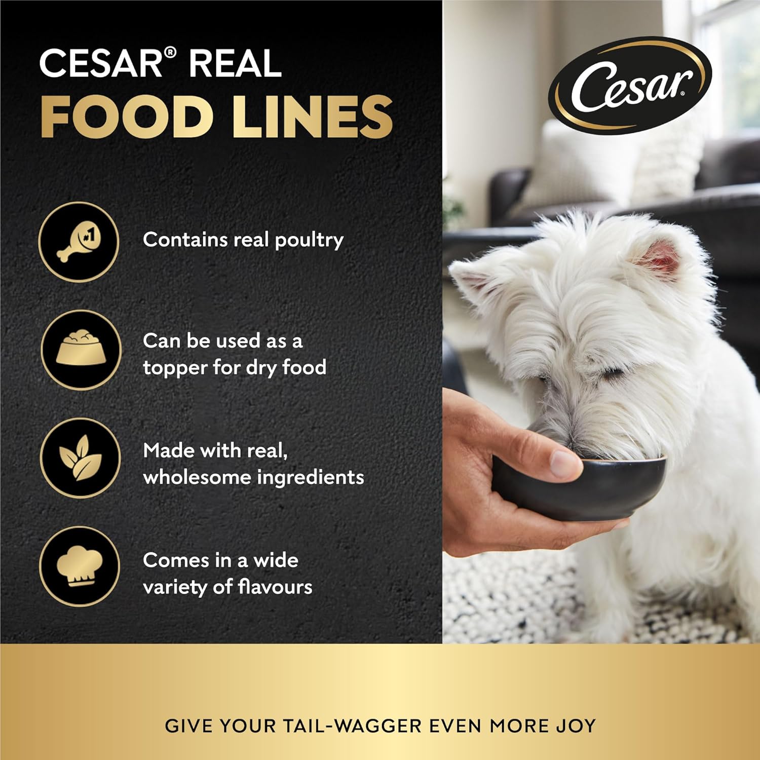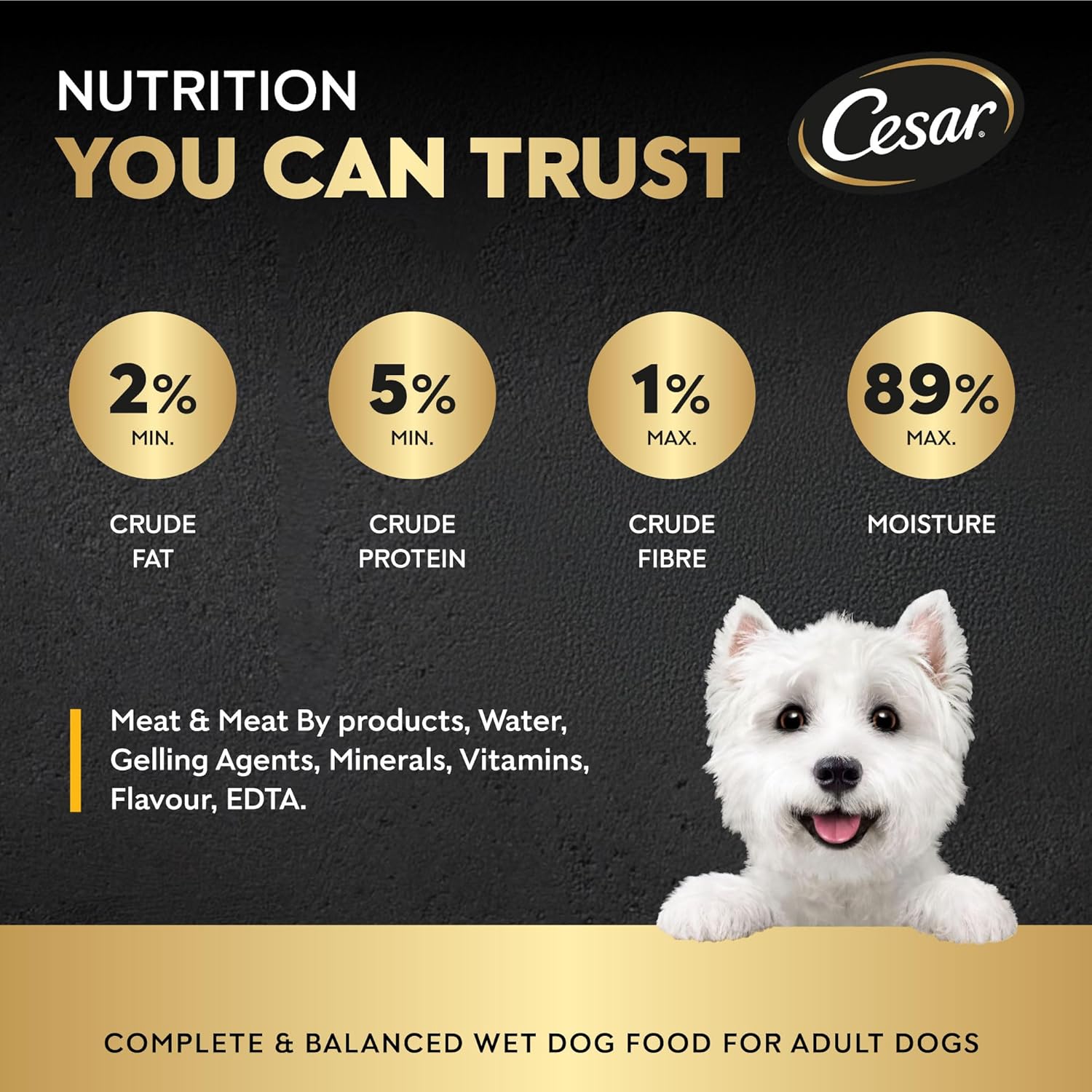 • CHOOSE CESAR CANINE CUISINE: Cesar dog food provides complete and balanced nutrition essential for your dog's health. With a variety of flavours and textures, it makes dog mealtime enjoyable.