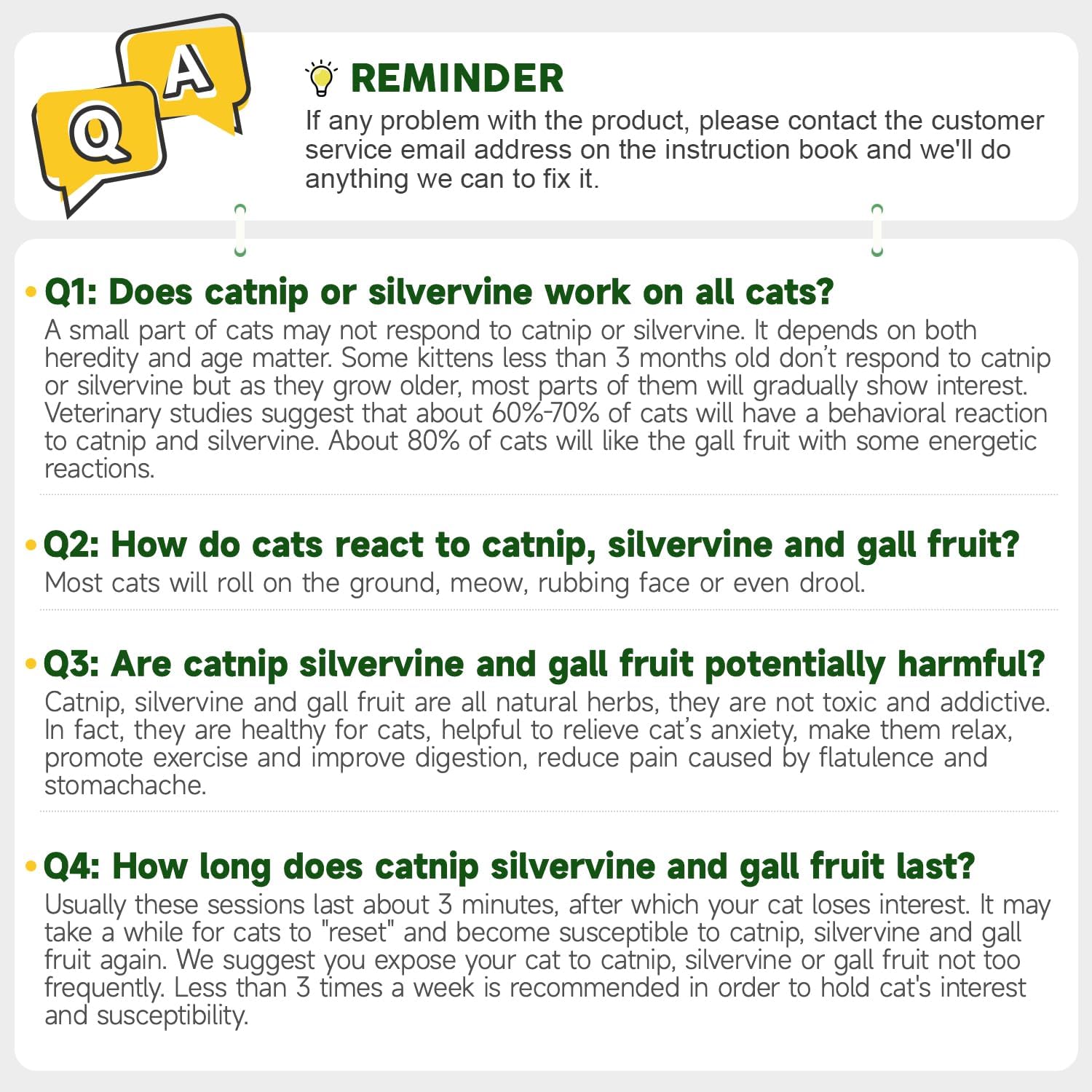 - 100% Natural and Non-toxic: the catnip balls are made of pure natural plant extracts, no chemical additives contained. Rest assured this toy is no harm to your favorite kitty. Includes 4 different flavors: “catnip”, “silvervine”, “fruit of silvervine” and "cat energy ball" that conspire to arouse your cat’s interest to lick and play