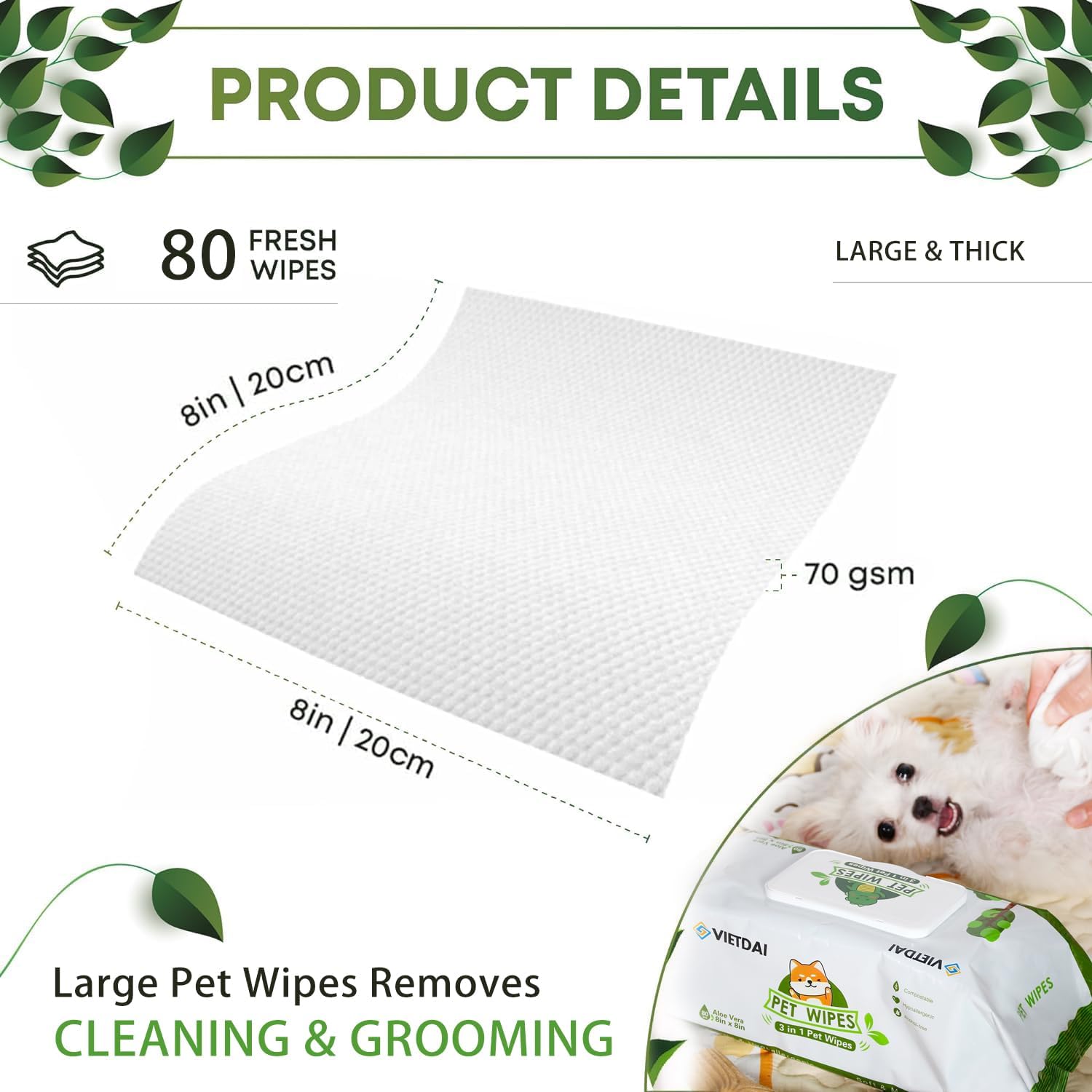 - 【HYPOALLERGENIC】- VIETDAI dog wipes unscented are proudly certified SDS, Pet wipes are completely alcohol-free, contains no irritating chemicals and with soothing aloe vera. In order to keep your dog and kitten skin and coat healthy, nourished, and moisturized, these pet wipes are a wonderful choice for all to enjoy.