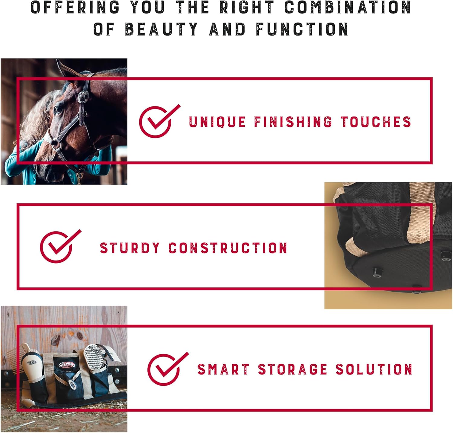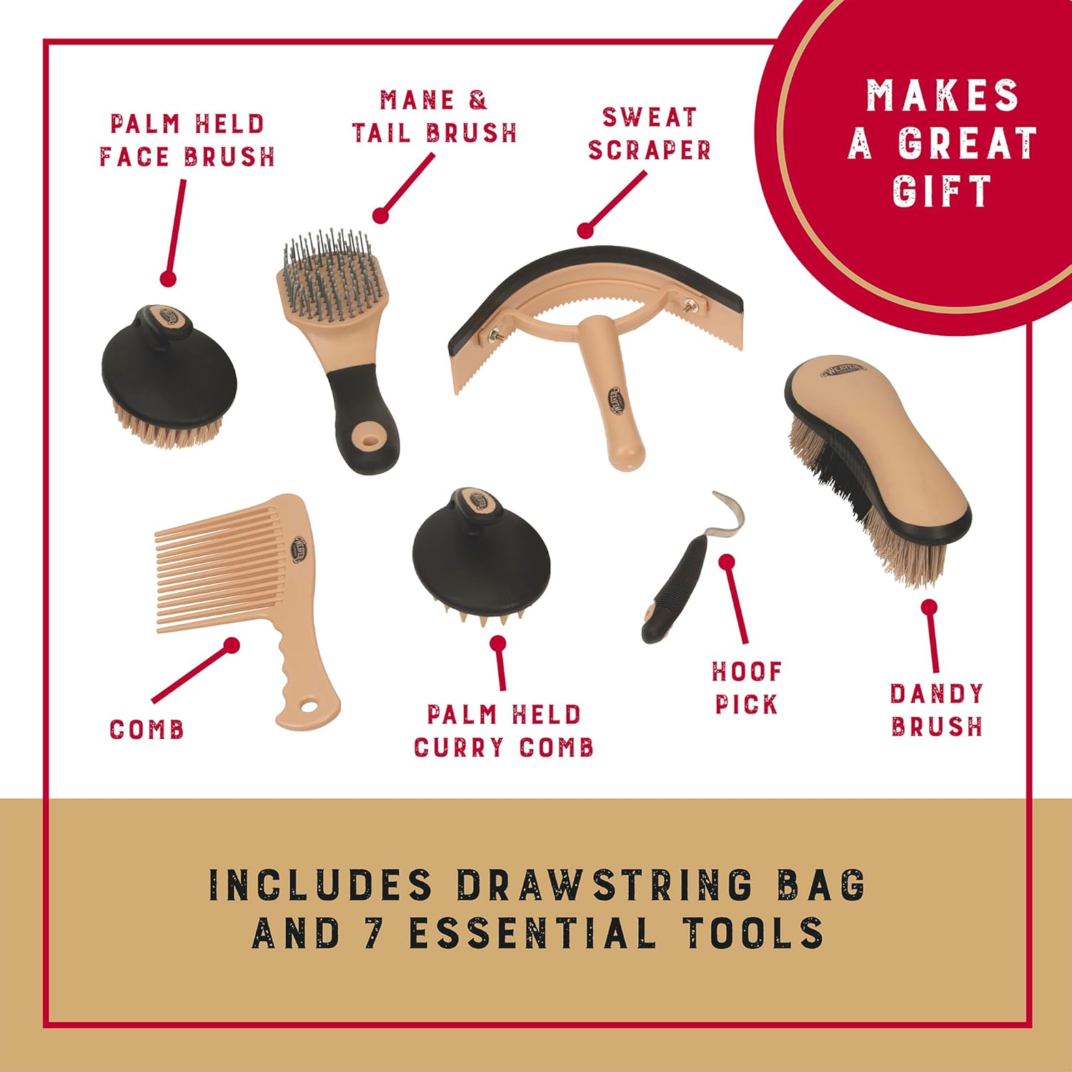 - Includes a comb, hoof pick, palm held curry comb, palm held face brush, mane and tail brush, dandy brush and sweat scraper/coarse curry combo