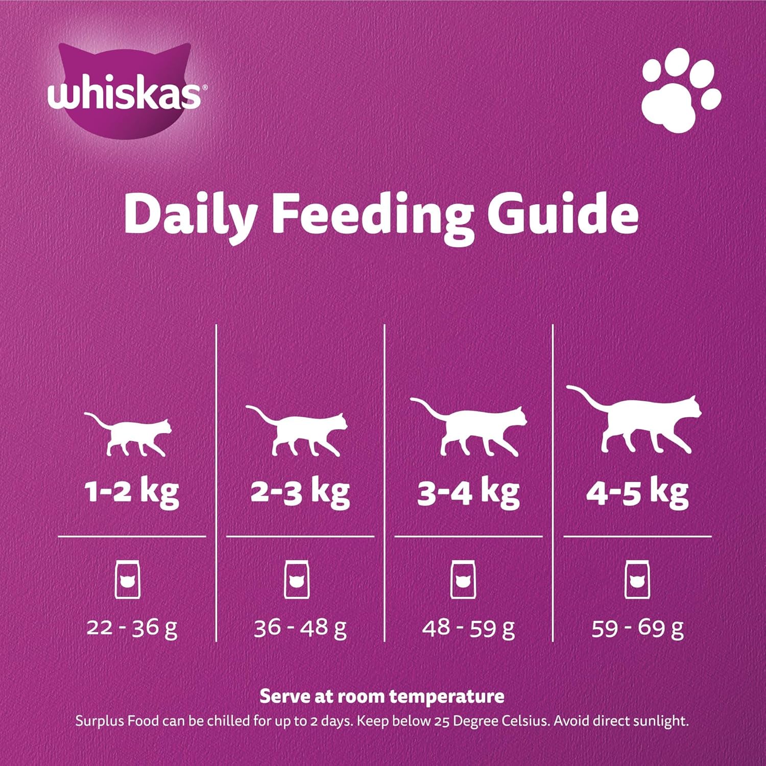 - CONVENIENCE FOR OWNERS AND CATS- Whiskas is convenient to keep and store once opened, due to its longer shelf life. Your cat will also find convenience in eating measured smaller volumes which is helpful for those that prefer to graze throughout the day