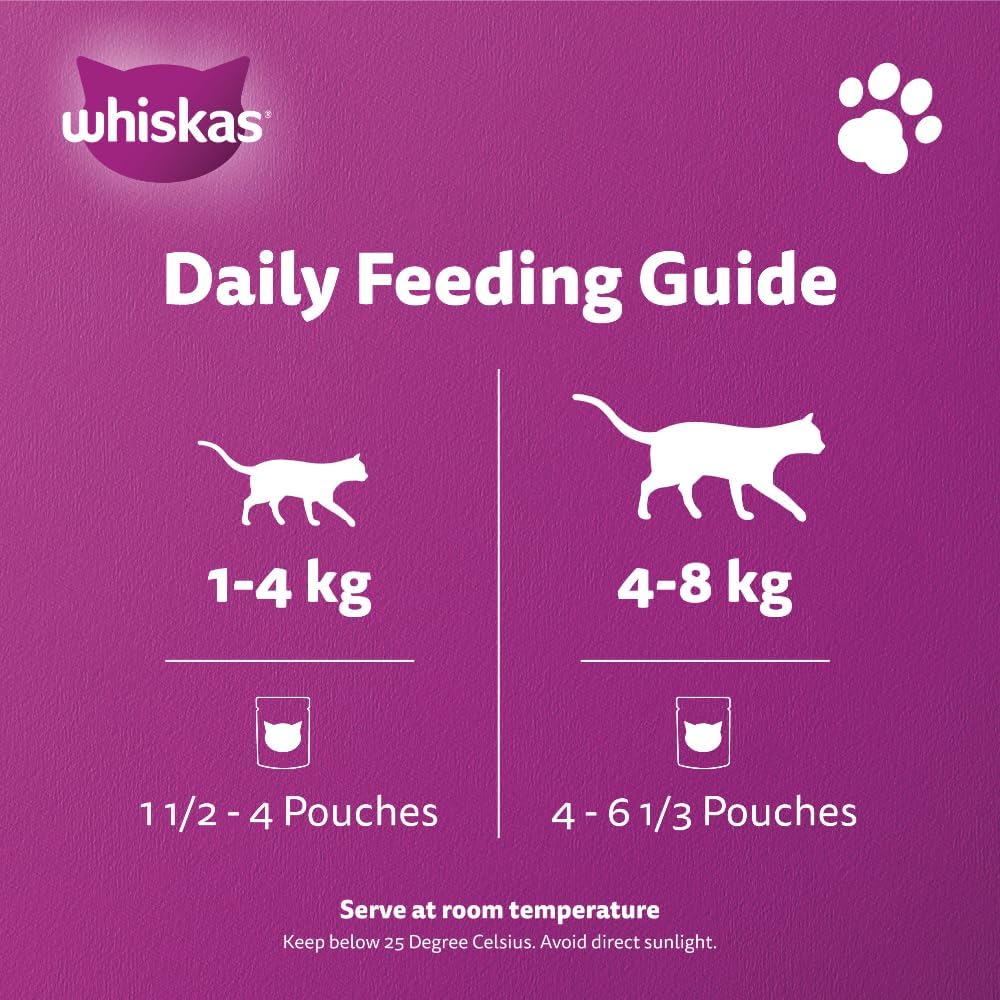- 41 ESSENTIAL NUTRIENTS: This Whiskas cat food is enriched with 41 essential nutrients for cats to be active, and vitamins and minerals for an effective body system. It contains omega 6, biotin and zinc to maintain your cat’s skin and coat