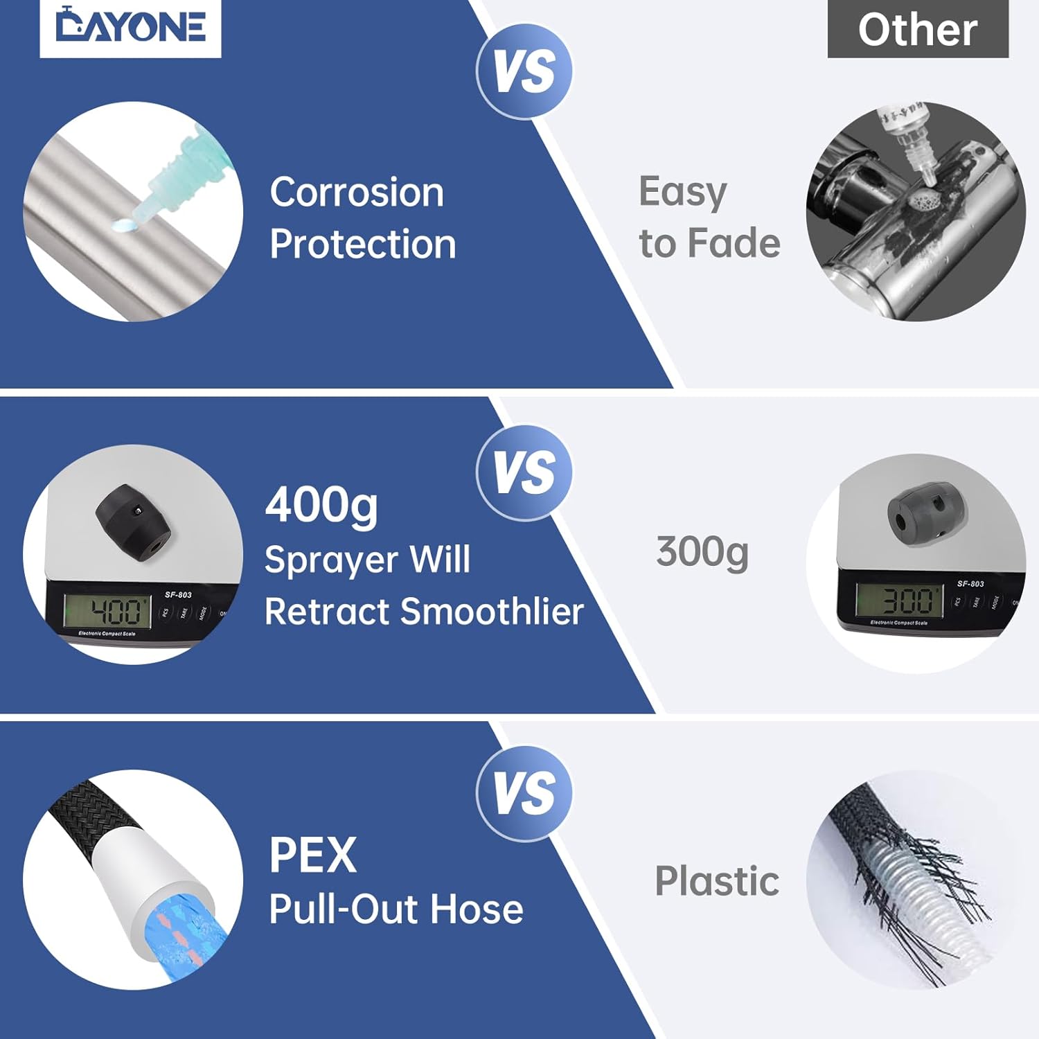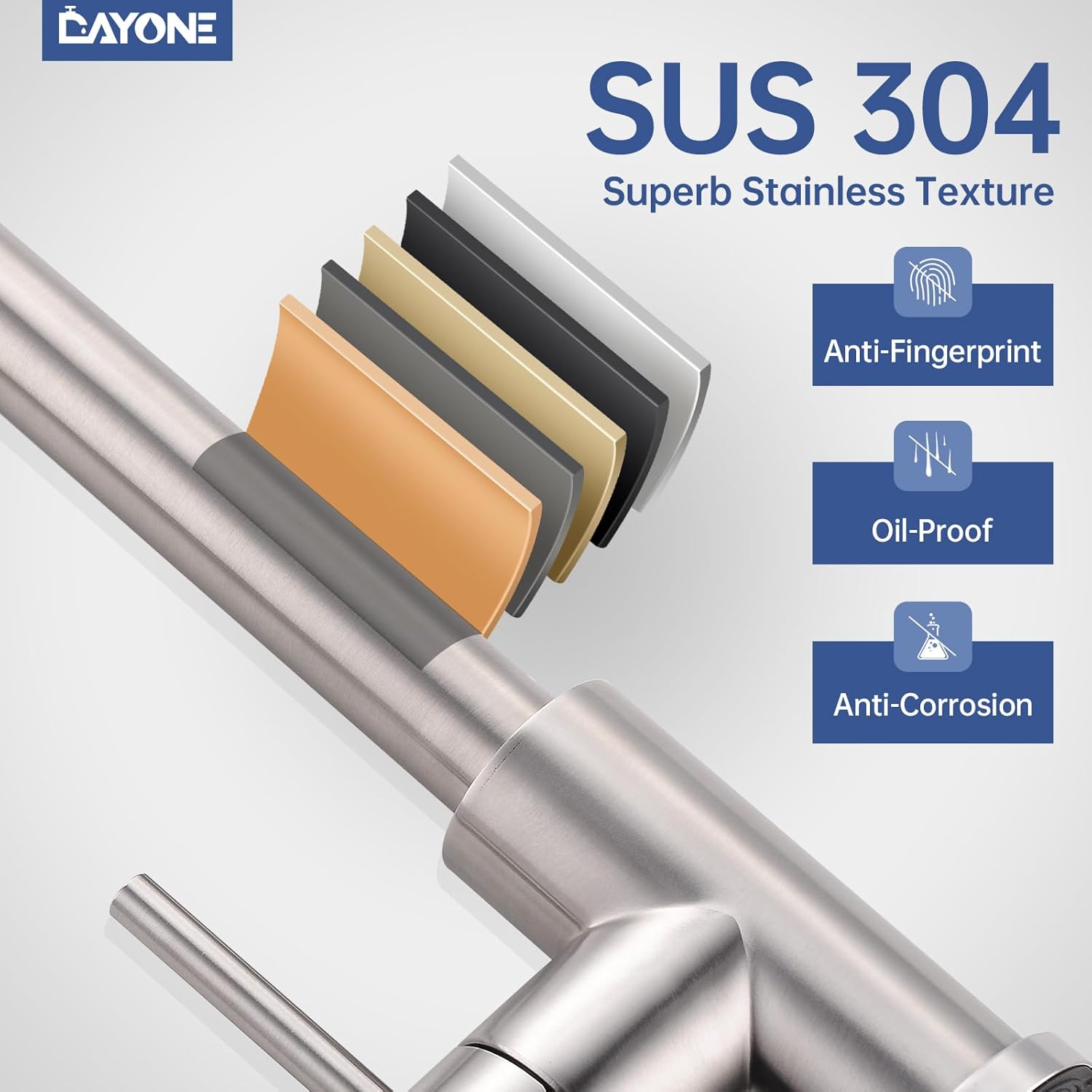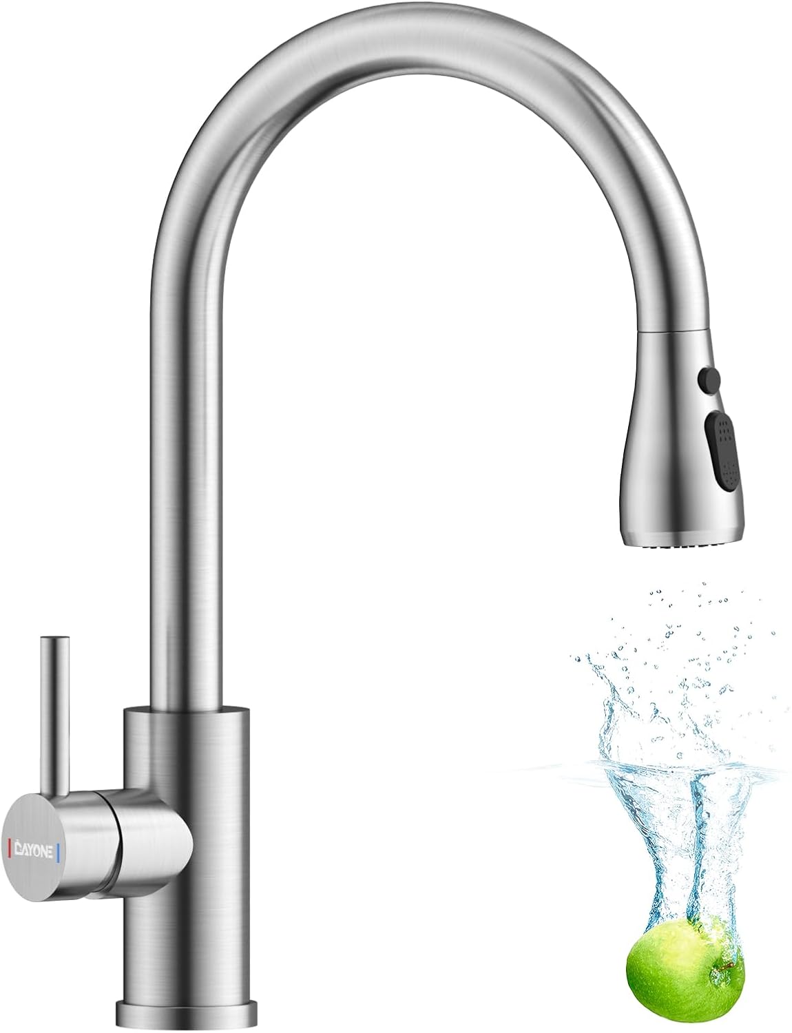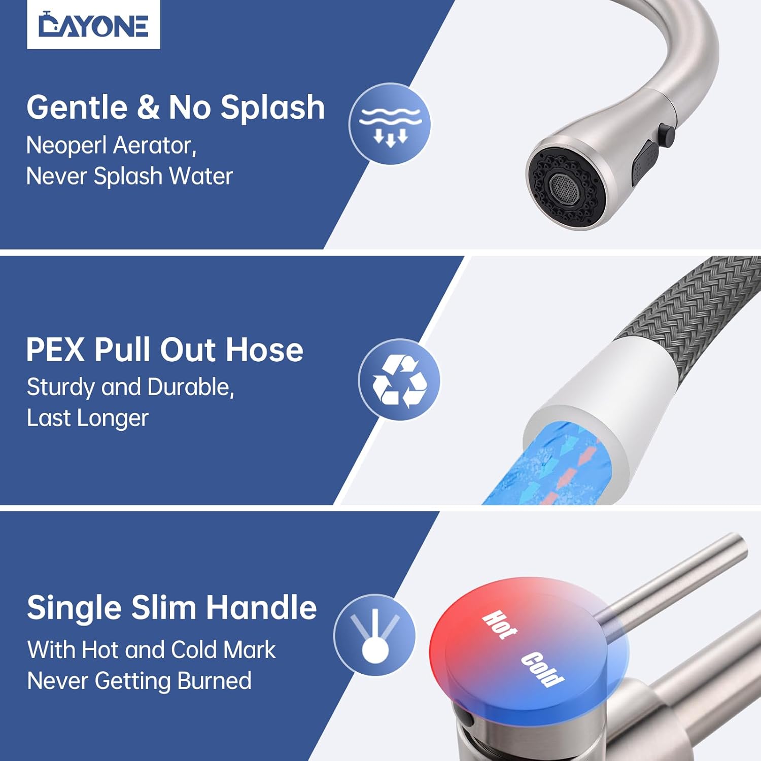 DAYONE Kitchen Faucet Mixer with Pull Down Sprayer Brushed Nickel, Kitchen Tap with 3 Water Modes for Sink, Single Handle High Arc Kitchen Faucets Stainless Steel