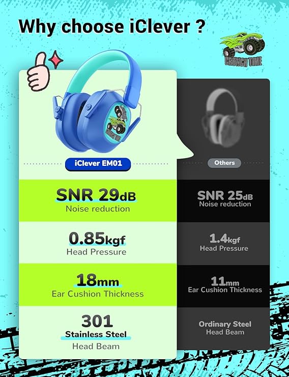- 【Ultimate Safety & Kid-Friendly 】iClever EM01 reduces sensory overload and other external triggers, perfect for kids with autism or sensory issues. Uses BPA-free ABS material and silicone-free earcups, just use these hearing protection ear muffs with peace of mind.