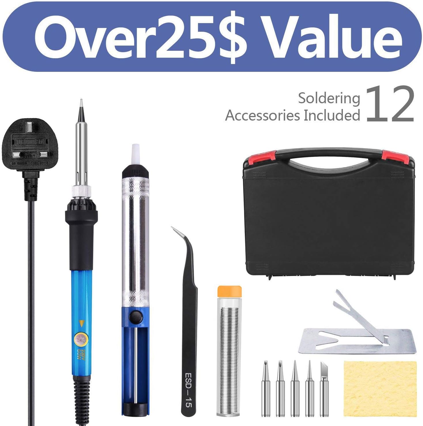 - 【12-In-1 Soldering Kit】- Soldering iron kit comes with soldering iron, desoldering pump, 5 multiple soldering tips, soldering iron stand, tweezers, solder wire, cleaning sponge and carry box.