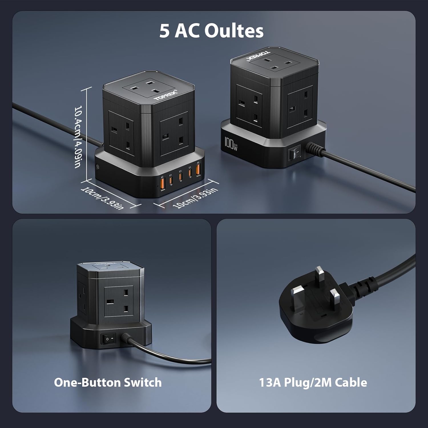 - 【10 in 1 Extension Lead with USB C Slots】With 5 AC outlets(3250/13A), 3 USB-C port, 2 USB-A and 1 switch. Specification: 10*10*10.4cm, 0.675kg, 2m extension lead. The tower design makes it easy to connect multiple outlets, keeping cables neat and tidy for desktop use.
