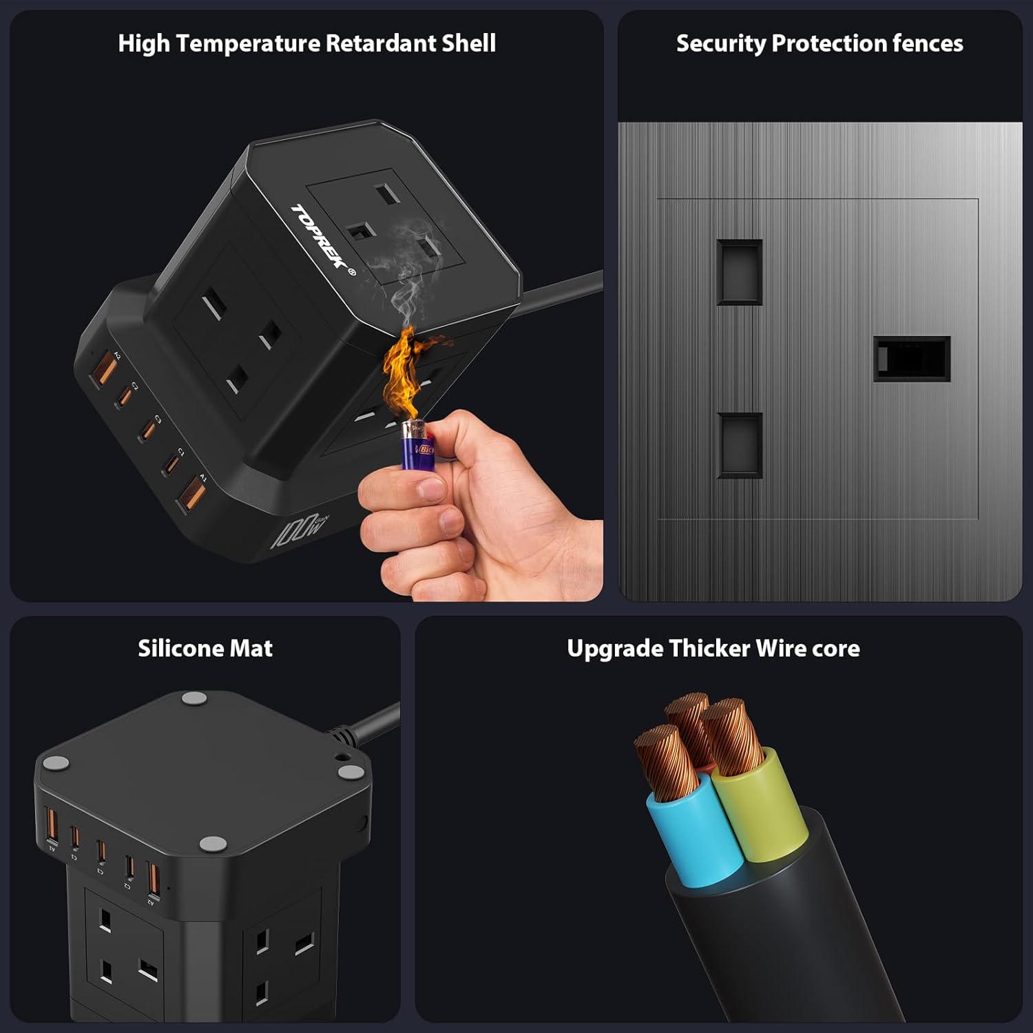 - 【Multiple Protection】Surge protected extension lead are certified by UKCA and RoHS, etc. The case is made of flame retardant 750 C V0 PC and is heat resistant to protect your valuable electronic devices. Equipped with child lock to protect your children from harm. 24 Hour Total Protection Features USB Over-Current, Short-Circuit, Over-Voltage, Over-Load, Over-Charging Protection, Fire Resistance(750℃/1382℉), Over Temperature Control.