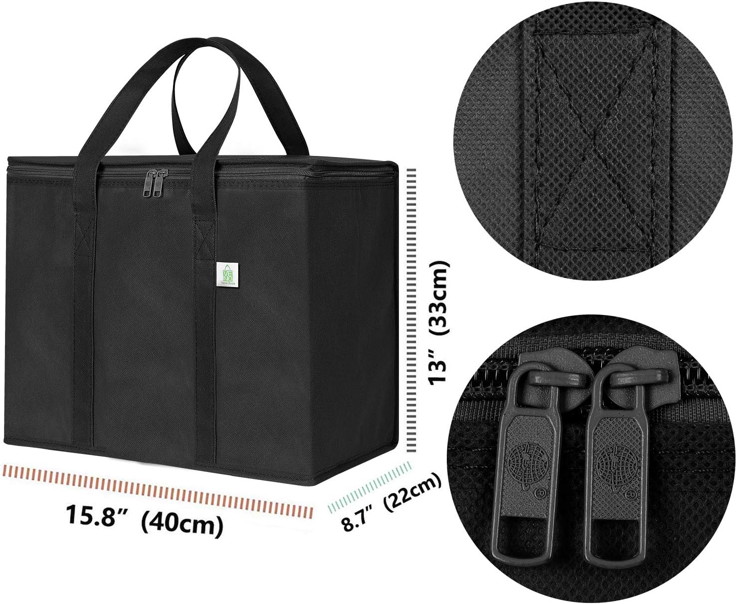 2 Pack Insulated Reusable Grocery Shopping Bag, Food Delivery, Cooler Bag, Heavy Duty, Large Size, Durable Handles, Dual Tab Zips, Lid, Stands Upright, Collapsible, Sustainable (Black, 2 Pack)