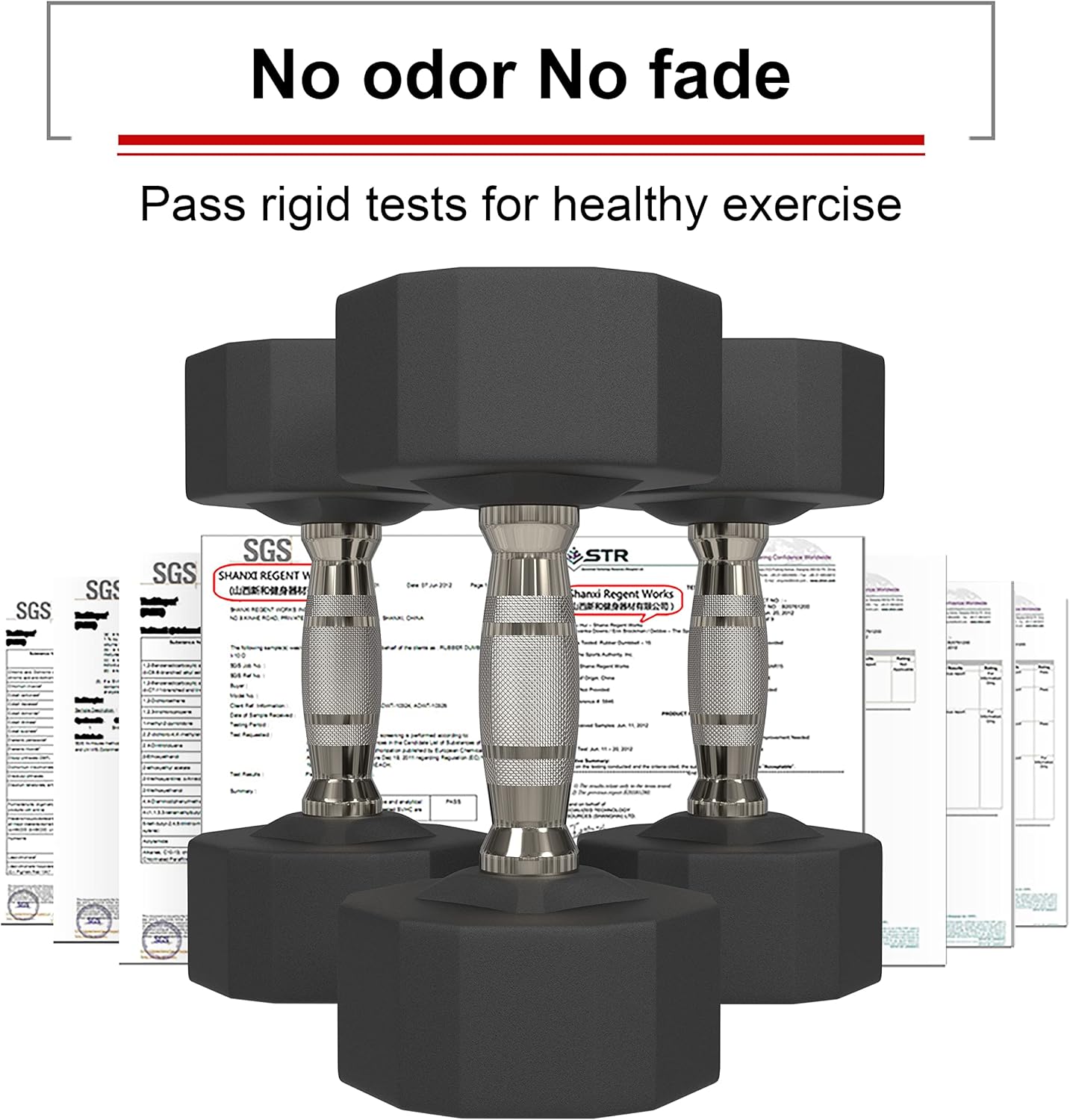 - 【Odorless & never fade】Unlike other hex rubber dumbbells has stink and fade, PROIRON dumbbell weights is encased in high density and environment-friendly coat, make sure hex weight odorless for your healthy workout. Our rubber dumbbells set reduces noise and never fade, protect home and gym floors/equipment from damage. In addition, our home dumbbells pass various tests in european laboratories to offer healthy fitness
