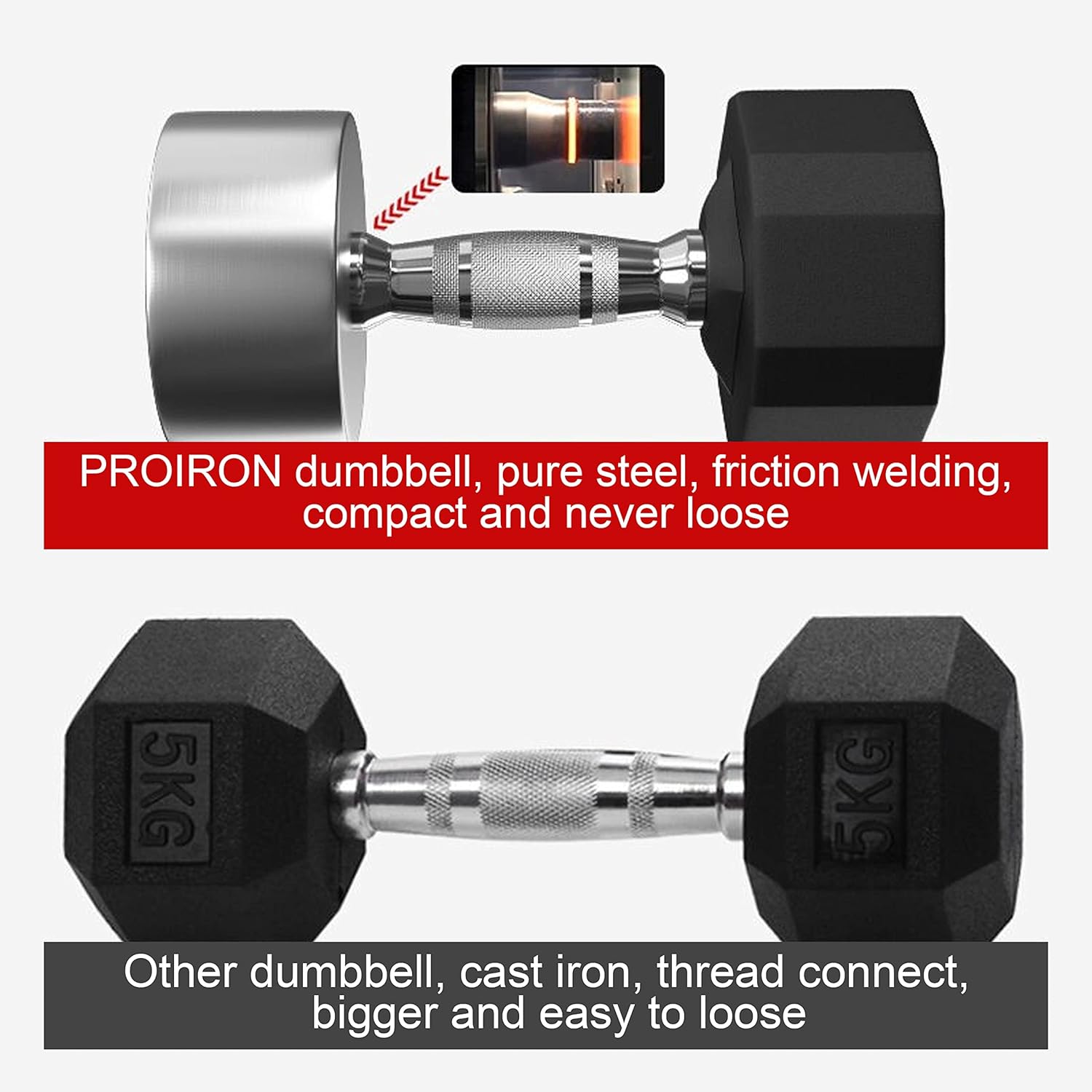 PROIRON Rubber Dumbbells Odorless, Steel Weights Set Men Women Home Gym 3kg 5kg 8kg 10kg 12kg 16kg 20kg 24kg Fitness Training Exercise Body Strength Lifting Equipment (Pair or Single)